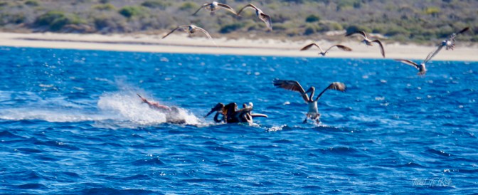 You can see how the fish is breaking apart in the thrashing process and the birds are ready to pounce on any scraps that fly free.