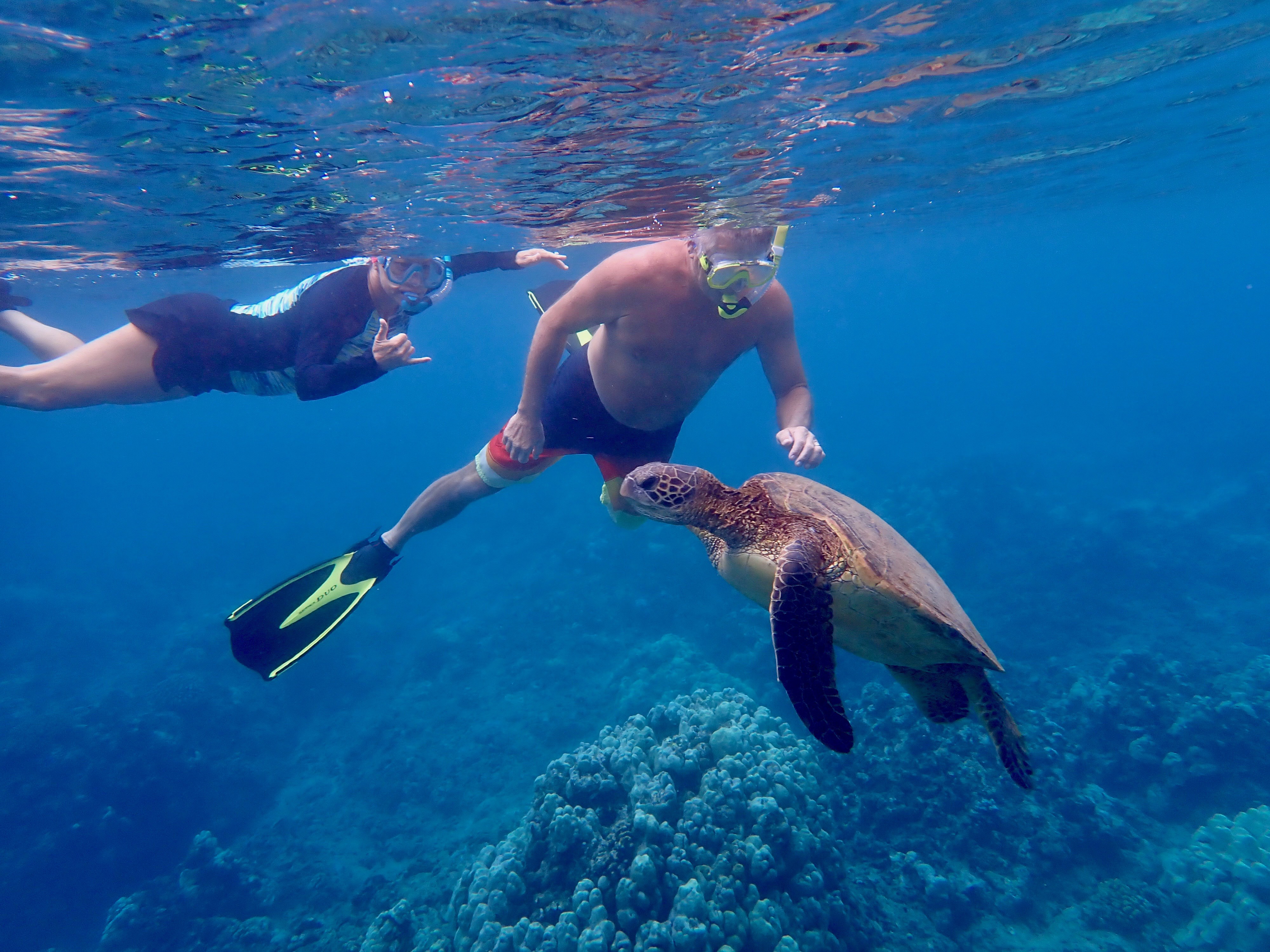 The turtle is unfazed by Shellie and Randy of s/v Moondance.
