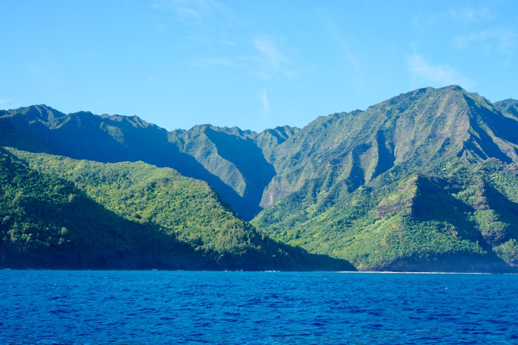 The Nā Pali Coast, found on the northwest side of Kauai, stretches for 16 miles. Pali means cliffs in Hawaiian and with some cliffs rising 4,000 feet out of the water, the area is aptly named.