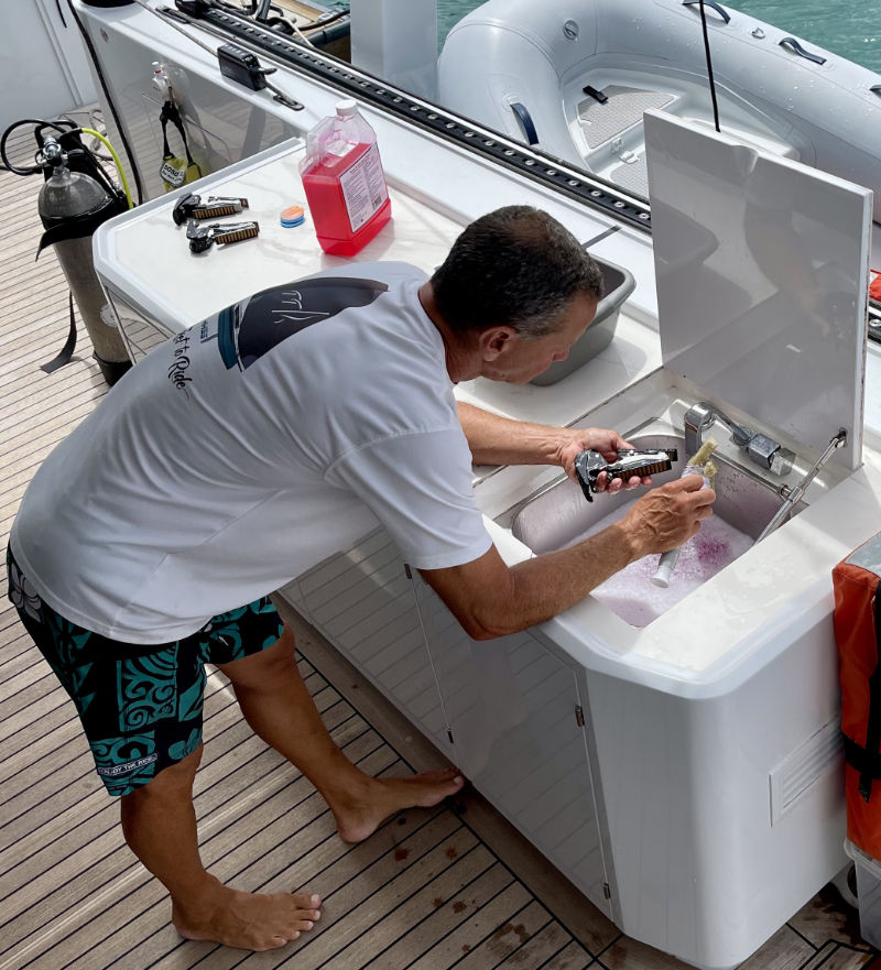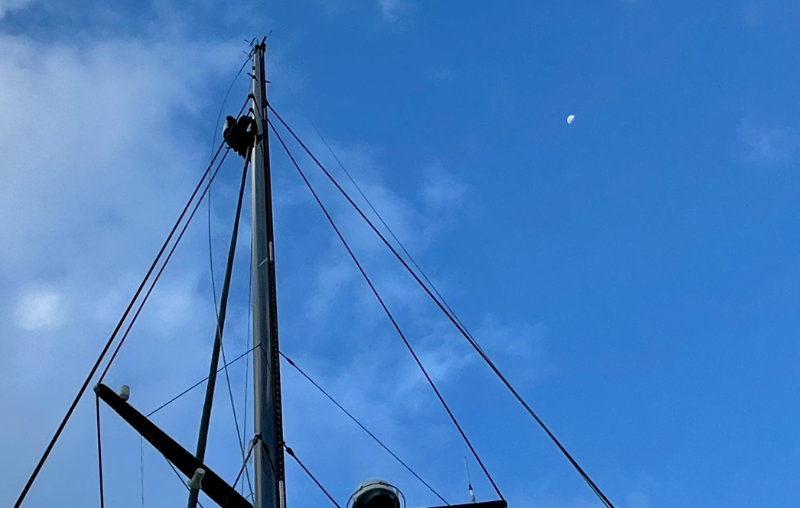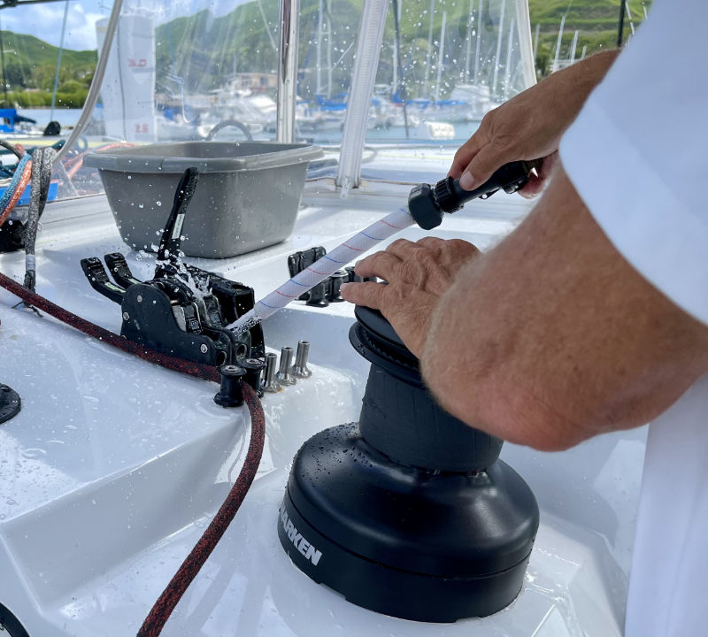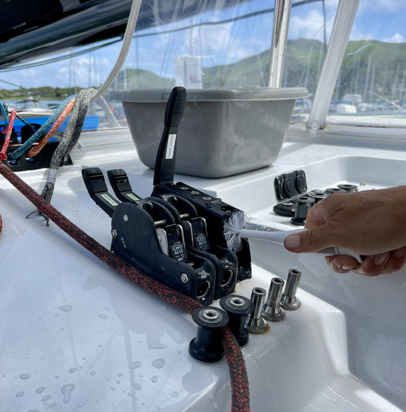 Recently we have been spending time on “boat love” like the servicing clutches. We have been tackling exciting jobs like polishing the brightwork, cleaning the bilges, oil changes, servicing the Pontos winch, cleaning the hulls under the water, “lifting” the mast for proper rig tension, testing lights and equipment on the mast, etc.