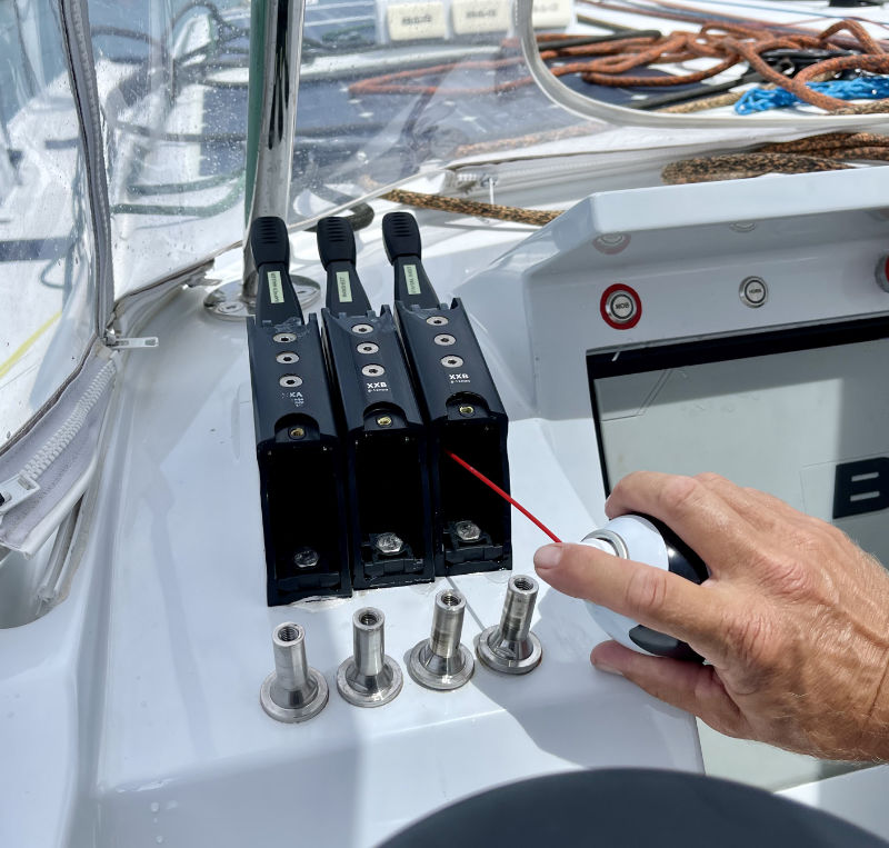 On the other hand, an open clutch will allow a line to move easily in either direction so we can trim a line (shorten) or ease a line (lengthen). Suppose we were sailing and suddenly a big breeze came up and we needed to release a sail because there was more power than we wanted. The line would run through an opened clutch to the release pressure on the sail.