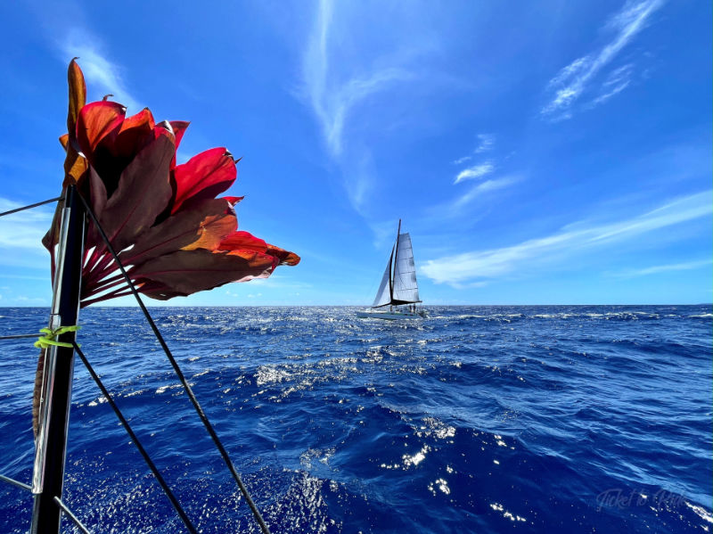 This trip began from Hanalei Bay, Kauai on June 14th with a stunning sunrise and dolphins escorting us away from Hawaii. Amelia’s friends gifted her Ti leaves (pronounced like tea) to ward off evil and give us safe voyage. The Ti plant was brought to Hawaii by Polynesians who believed the plant had divine powers. Hawaiian tradition says that the God of Fertility, Lono, and the Goddess of Hulu, Laka, considered the Ti leaves sacred. Today Hawaiians say using these leaves wards off evil and brings good luck. Thus these leaves are used when making leis, in a grass skirt, or as a cheering noise maker to bring good luck to a favorite sports team. In our case, the Ti leaves were placed on TTR’s bow and each side of the transom to bring us safety and luck on our journey. We shared some of the Ti leaves with s/v Kālewa to insure their safe passage as well.