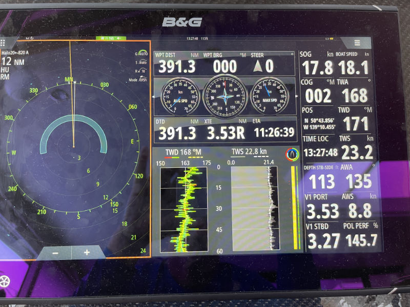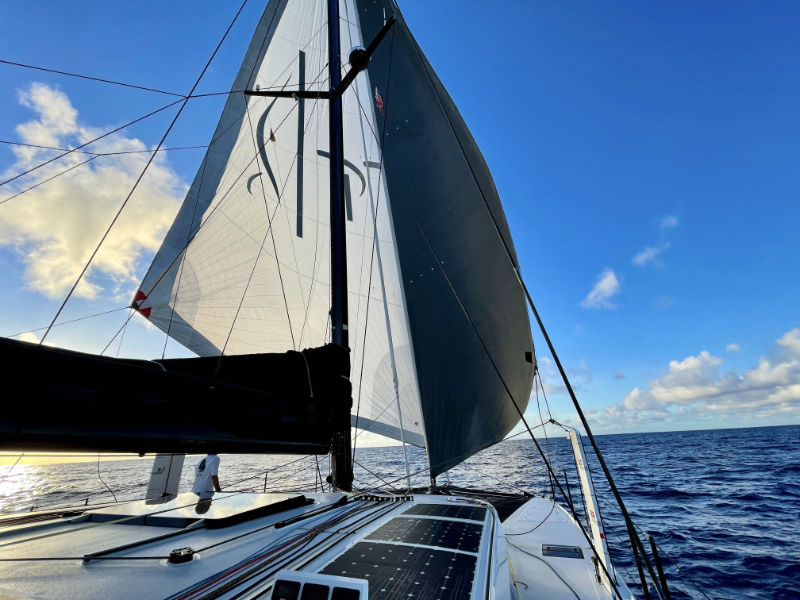 We left Hawaii with one reef in the main sail and the genoa deployed. We completed the whole passage with R1 (one reef) in the main sail.