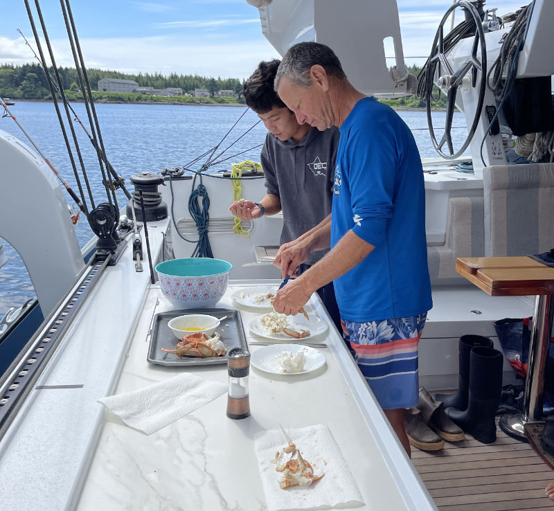 The next morning we left DeGroff to return to Sitka but we found that DeGroff had gifted us two additional crabs in our trap. Since Tommy was scheduled to fly out of Sitka that afternoon, we cooked the crab and ate our fill for lunch as soon as we anchored in Sitka.