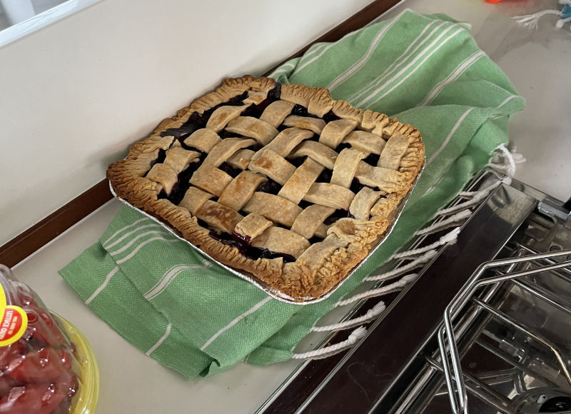 Gambier Bay was riddled with crab pots, so Erik and Frank thought they would score at least one crab, but we were skunked. Not a single crab to show for their efforts. We did find plenty of wild blueberries which Erik transformed into a delicious pie.