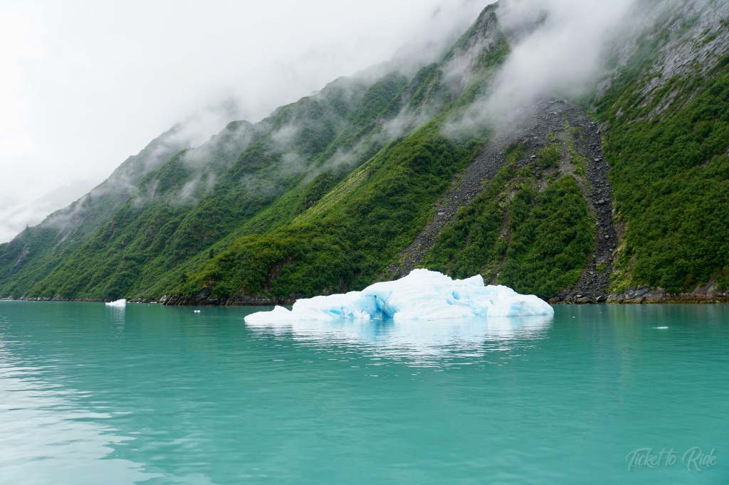 We were so enamored of our first glacier that after motoring back to Entrance Cove and anchoring TTR, we went out in the dinghy and lassoed one floating chunk of iceberg and tried to take it back to Ticket to Ride with us. However, sanity returned and we dropped “our iceberg” for fear it would float around the anchorage and damage a boat or two.