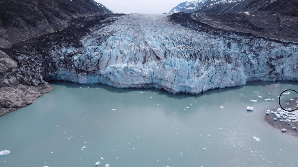 Lamplaugh Glacier in Glacier Bay National Park. For perspective of size, 4 of the day’s crew are standing by the edge of the water in the black circle. Please, scroll in.