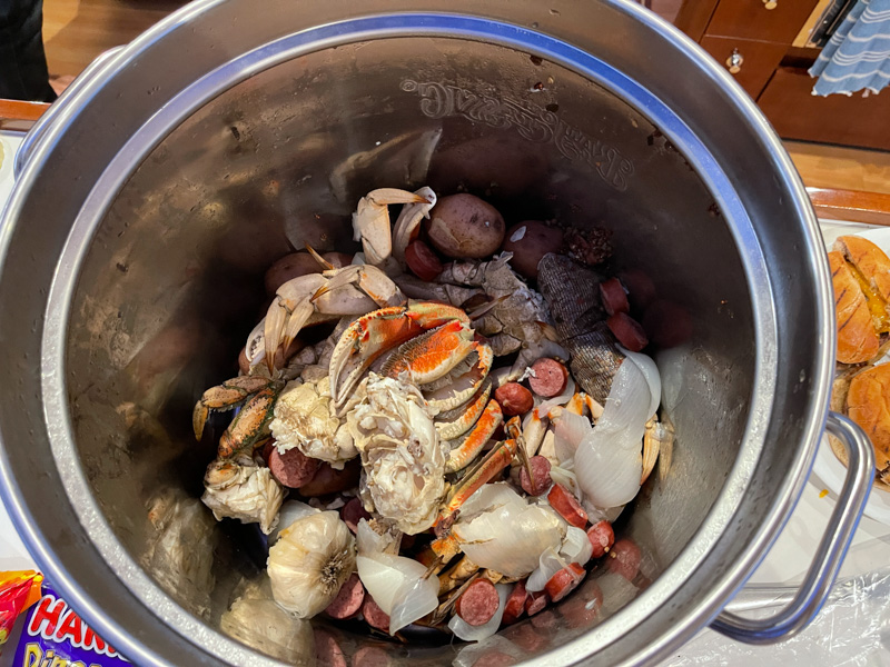Shellie and Randy arrived, and as experienced cruisers, they packed lightly and were quickly settled into their room on TTR. Of course we kicked off their visit with a dock party! s/v Kālewa was on the dock, so Katie and Kevin, Amelia and Erik, Randy and Shellie and Frank and I shared a spur of the moment combo lobster boil and burger bash. The eight of us had a great time reconnecting; sharing food and libations as we discussed our itineraries.