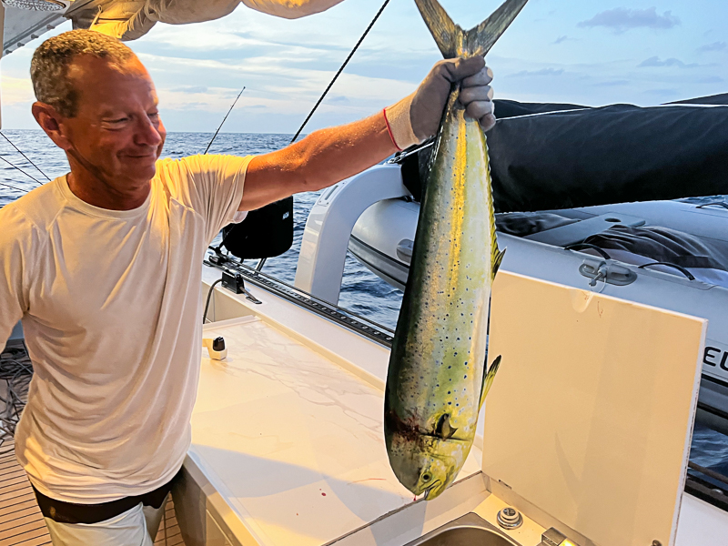 Sunday as the sun was descending into the horizon, the starboard side fishing rod zinged to life. Amelia and I handled sail furling while Frank and Erik pretended to be participants in The Deadliest Catch! Actually, they didn’t pretend anything, but they did land a beautiful Mahi! Yum!