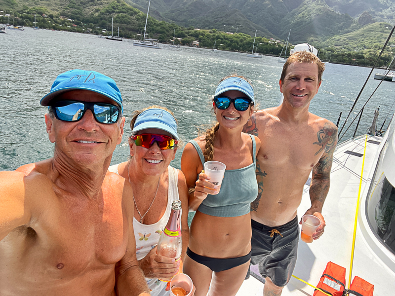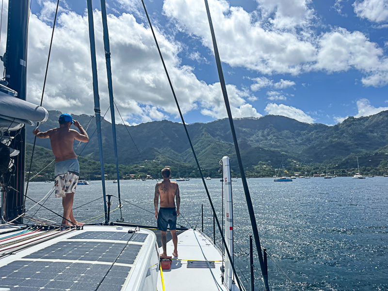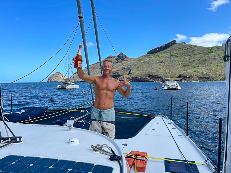 The day after Erik’s birthday we could clearly see Nuku Hiva in the dawn light. A small group of dolphins acknowledged us by swimming past us as we approached Taiohae Bay. The water washing against and away from the mighty elevation of Nuku Hiva was sharp and tumultuous as we jetted in under main and reacher. By 10:20 am on May 11, 2022, 13 days and 23 hours after leaving San Benedicto, we had set our anchor in French Polynesia. We had completed our passage to French Polynesia and achieved a milestone! Without regard for the early hour, we broke out the bubbly to celebrate a successful and excellent trip across the Pacific Ocean.