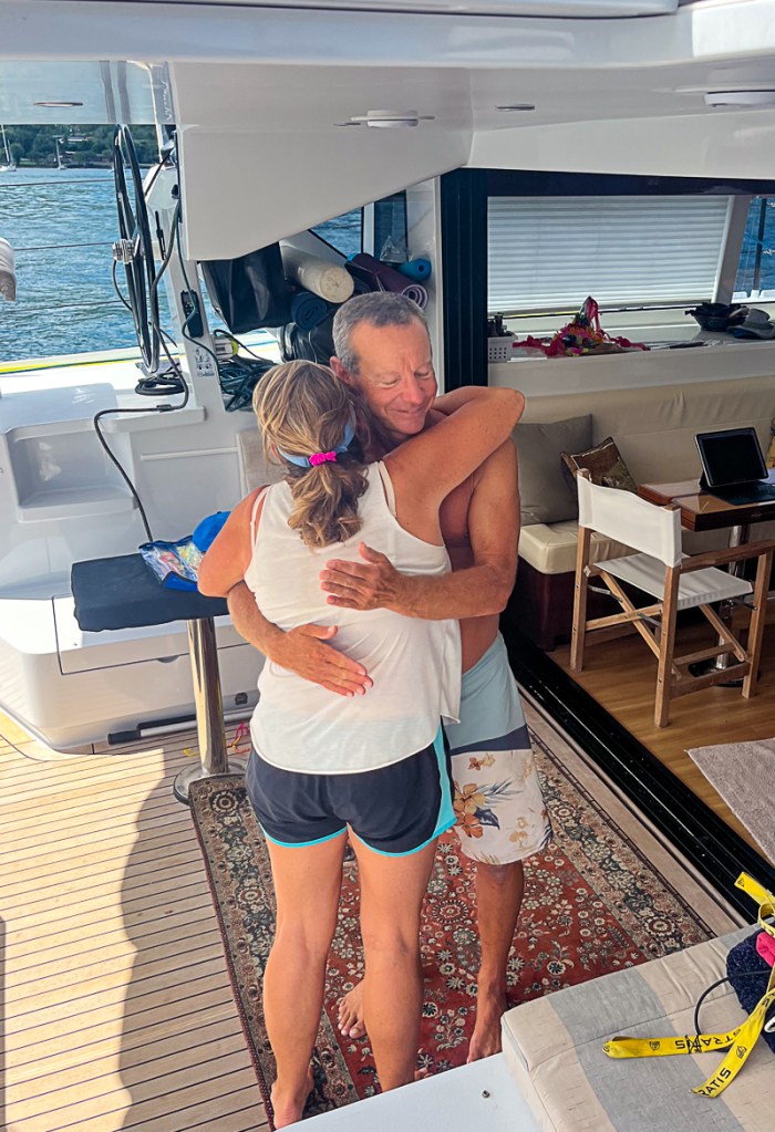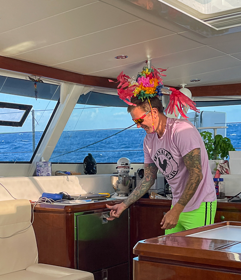 Calm passages are a good time to catch up on some “Boat Love,” as we refer to many boat jobs. The skies were clear, the seas were calm and we took a moment for some TTR maintenance. I polished a little bright work while Frank waxed some painted surfaces. Not wanting his shoulders overexposed to the sun which was growing more powerful as our trajectory moved us closer to the equator, Frank donned a shirt for protection. However, the combination of sun and effort soon had our captain’s temperature rising; so in the best way possible, Frank made a costume adjustment and rocked his Britney Spears look!