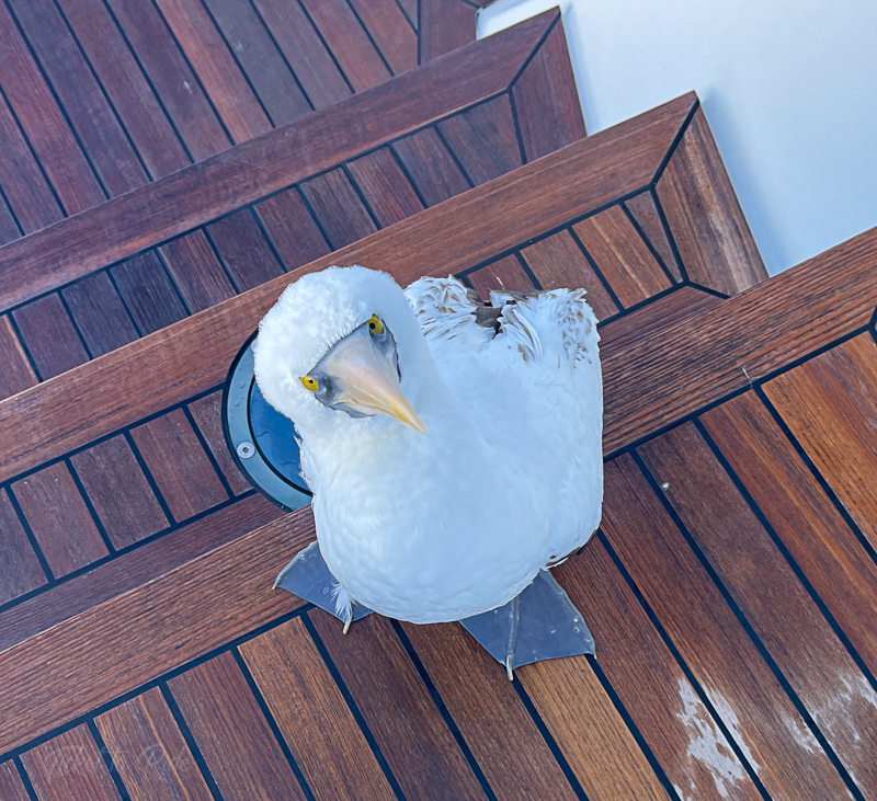 Imagine our dismay when we realized a Booby Bird had snagged our line! We brought the bird in as gently as we could and found he had tangled a wing in our line. Thankfully, he allowed Frank and Erik to carefully remove the line – he didn’t even become aggressive. Really quickly the line was free but the bird chose to ride along with us for about 15 minutes while he was catching his breath. Perhaps Lenny gave him confidence that we were safe.