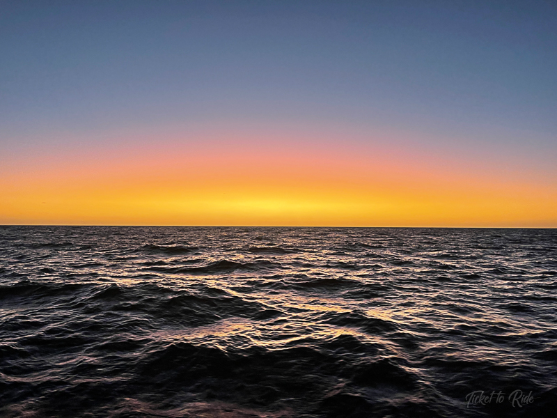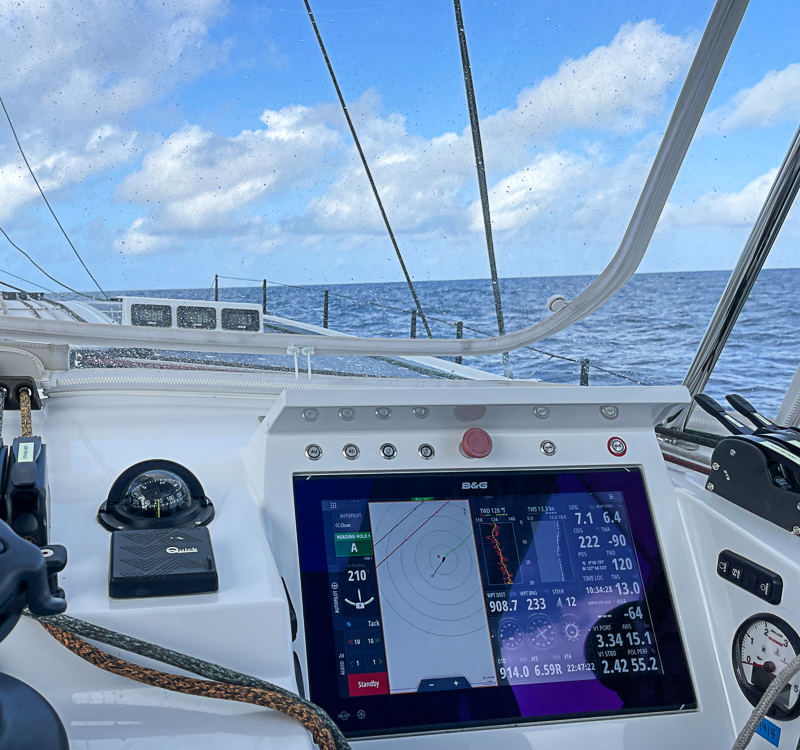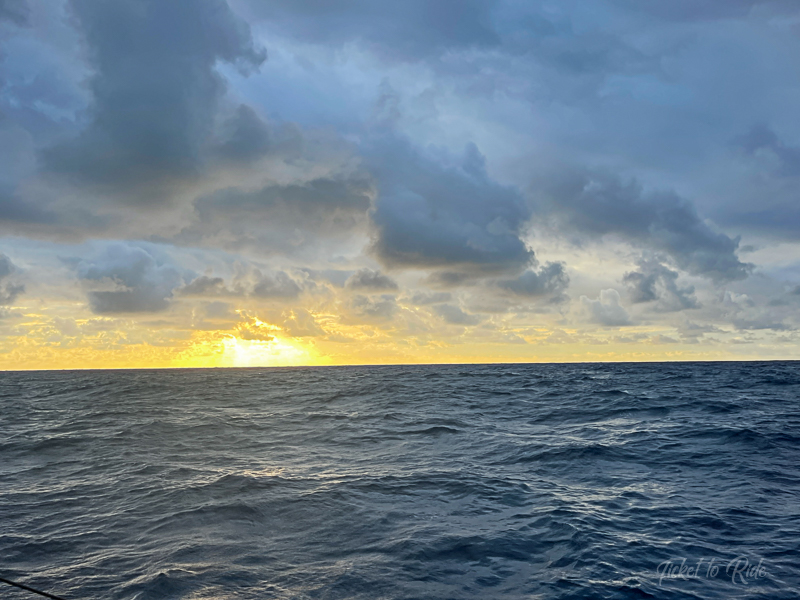 Days and nights on passage are a collidescope of skies, ocean, sunsets, sunrises, naps, food, podcasts, music, stars, stars and more stars! After a few days, a loose routine sets in where we rotate night watches of three hours each, unless there is a weather concern, then we have two people on deck for six hours and they take turns up and sleeping. During the daylight hours, with four souls on board, it is easy to grab naps as needed because somehow all of us end up wanting to sleep at different times. This trip we changed watch hours so that we could have a variety of views; one person didn’t always have the sunrise or the deep dark hours around 2 am.