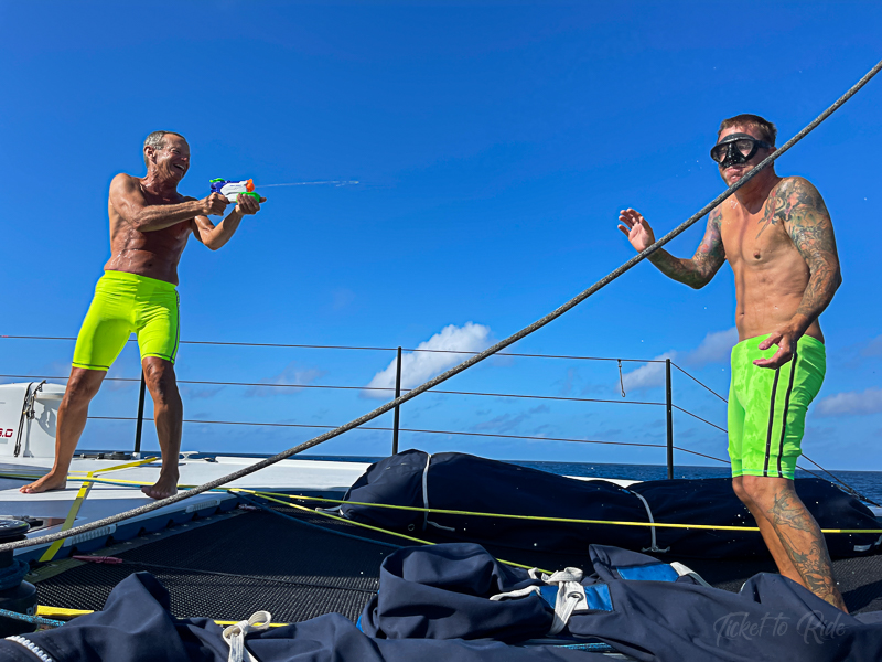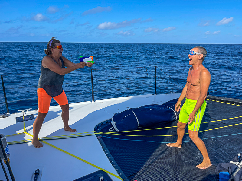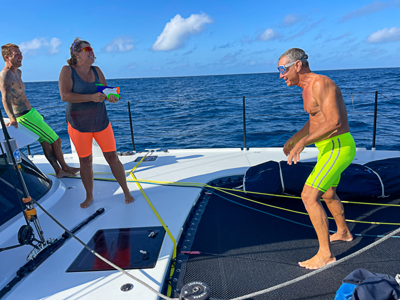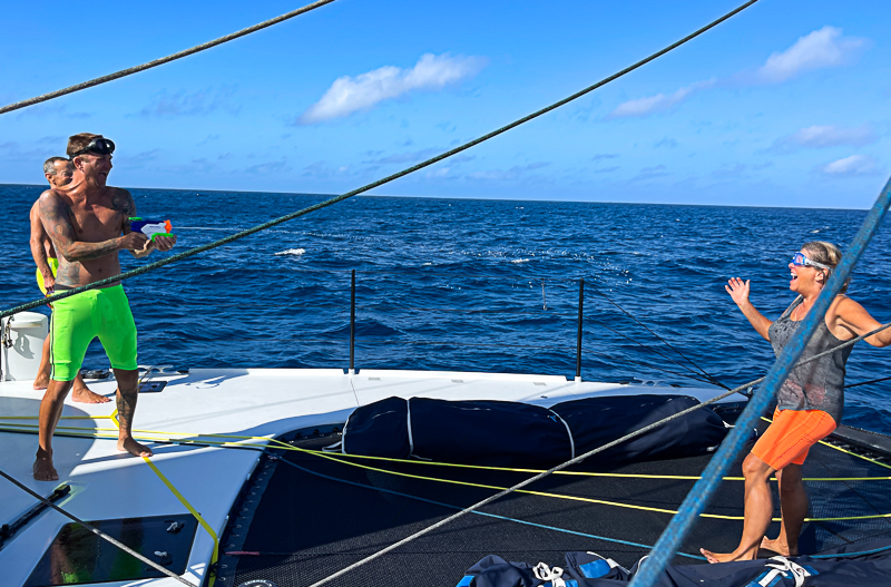 We uninitiated pollywogs weren’t certain what this tale foretold, until Amelia decoded the instructions…. we were to take turns: one dirty pollywog would don swim goggles and stand in the middle of the trampoline while another slimy pollywog would shoot him in the mouth using a squirt gun filled with “truth serum.”