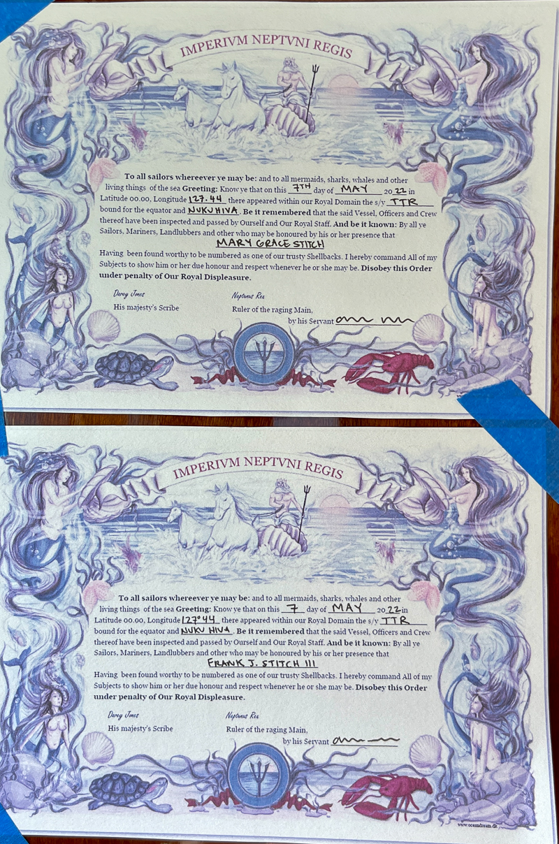 Amelia slipped away and returned with our official Shellback Certificates which we now have prominently displayed in our room.
