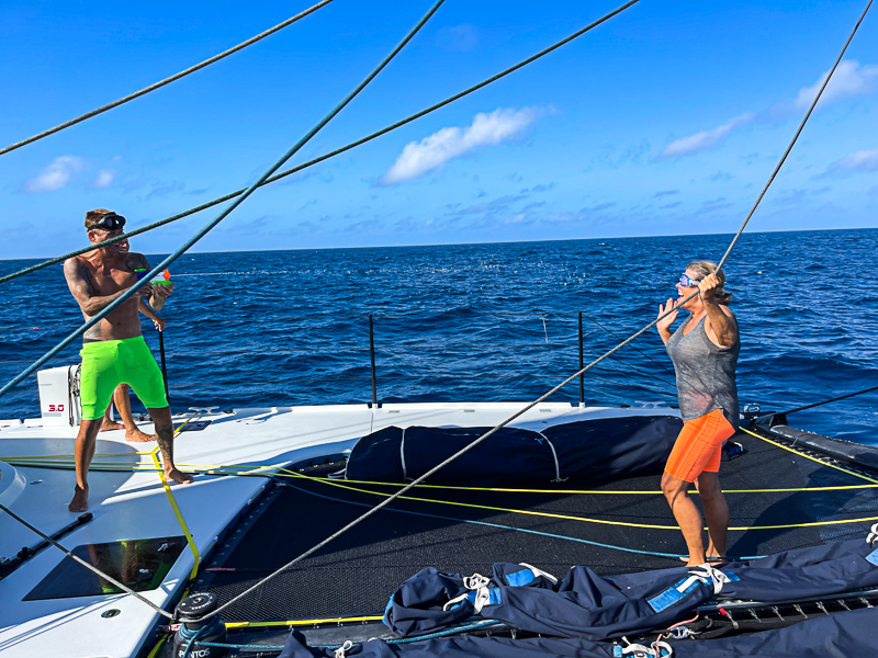 The final act of our celebrating our arrival at the equator was deploying the floating line behind TTR and all of us jumping into the water. Once again, we were swimming in the brilliant blue of the Pacific Ocean. This time at N 0° 00.000’! Our location was further south and we were a ship full of honorable shellbacks; the dirty pollywogs were no more!
