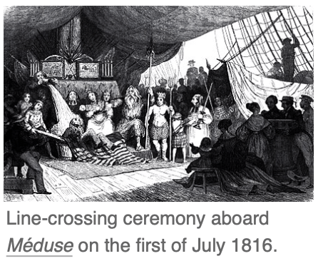 When researching the “Crossing the Line Ceremony,” I learned that this practice was originally created as welcome “folly” to boost morale on board ships. The pollywogs had to endure some pranks and prove they were capable of handling long and uncomfortable passages before being declared Shellback worthy. Even prominent guests on board ships were included in the initiation. Charles Darwin’s account from February 16, 1832 describes a bit of his initiation experience and concludes “at last, glad enough, I escaped.”