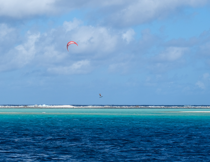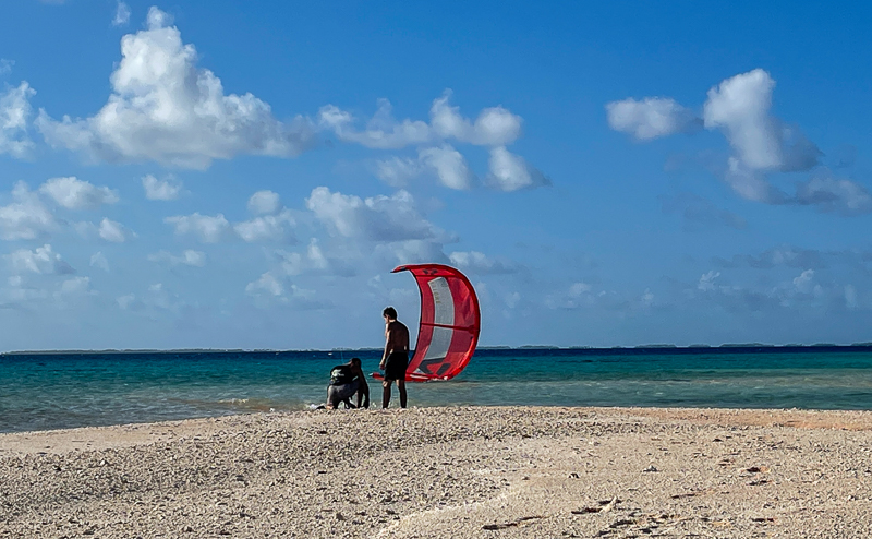 Kiting was the focus of the first two days of Hunter’s visit. We even managed to find some butter smooth water between a sand spit and the atoll’s rocky, fringe reef.