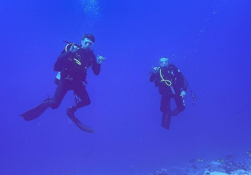 Frank dropped Hunter at the perfect spot to drift toward the mantas and get a close look at the giant, gliding rays. Compared to the manta rays we dove with in the Revillagigedo Islands, Mexico, the mantas here are very skittish and will swim away if approached by people.  We have found that if we drift toward them or allow them to come toward us, we have more success getting closer to them. We do not touch them, but it is fun to get close and see them gracefully skimming along as they feed.