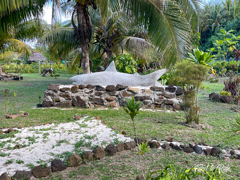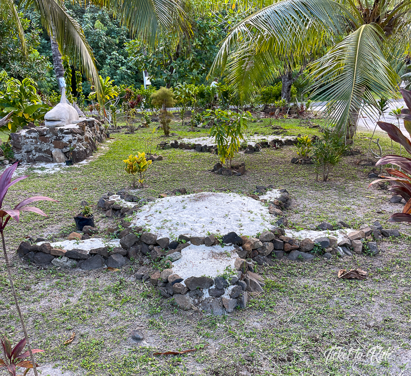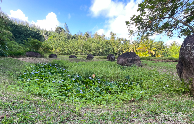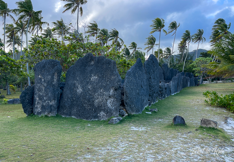 In French Polynesian history, open air temples called “maraes” were used for religious ceremonies. The maraes were built of coral and stone. The one we were looking for was not restored and all that remained was a stone floor near a cliff overlooking the lagoon where Ticket to Ride was anchored.