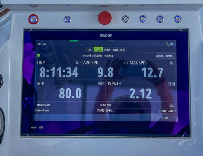 Even though TTR was well stocked and filled with fuel, we managed to complete the trip in just over 8 hours, averaging 9.8 knots of boat speed under main and reacher.