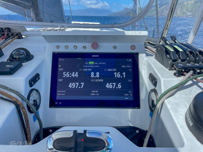 We departed from Amanu, Tuamotus and sailed 500 nm to Tahuatu, Marquesas. The majority of this upwind passage was sailed at a true wind angle of 55° or less with winds around 20 knots.
