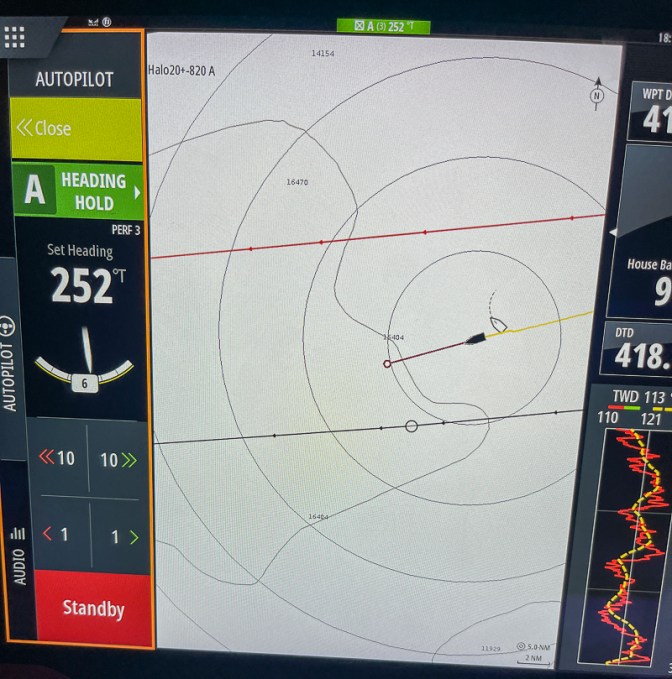 Monday was a good day with our average boat speed at 9.6 knots.  During the day we flew the main R1 and the Drifter, but around 10:30 pm once again we had to furl the Drifter and deploy the genoa. The apparent wind speeds were becoming too much for the Drifter.  The seas were building, but still manageable.
